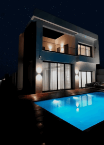 Baies vitrées de grande hauteur incluant systèmes à levage, triple vitrage, motorisation possible, esthétique ultra-minimaliste. Conçues pour projets de luxe exigeants.